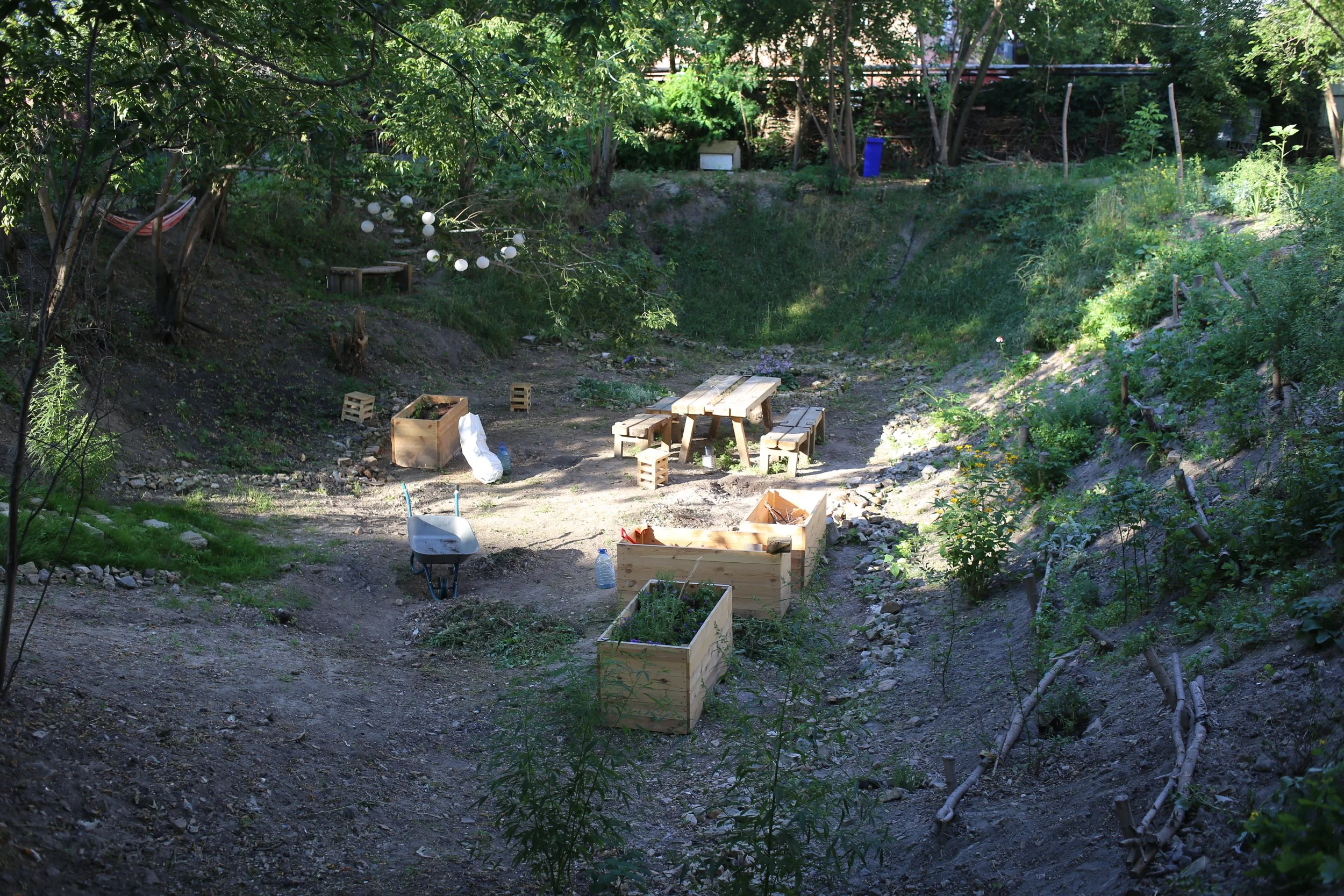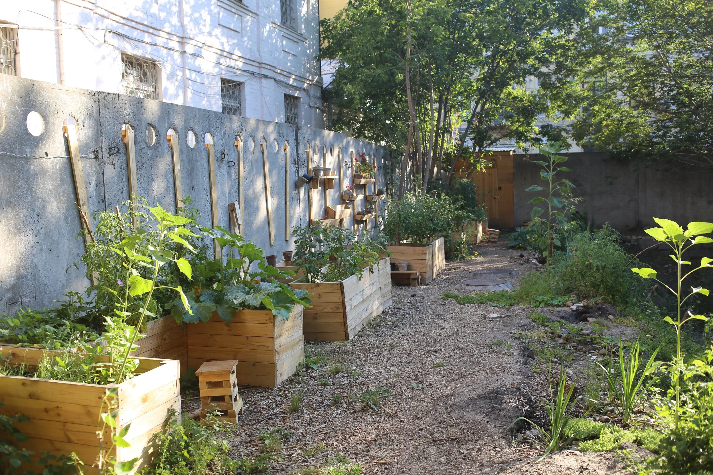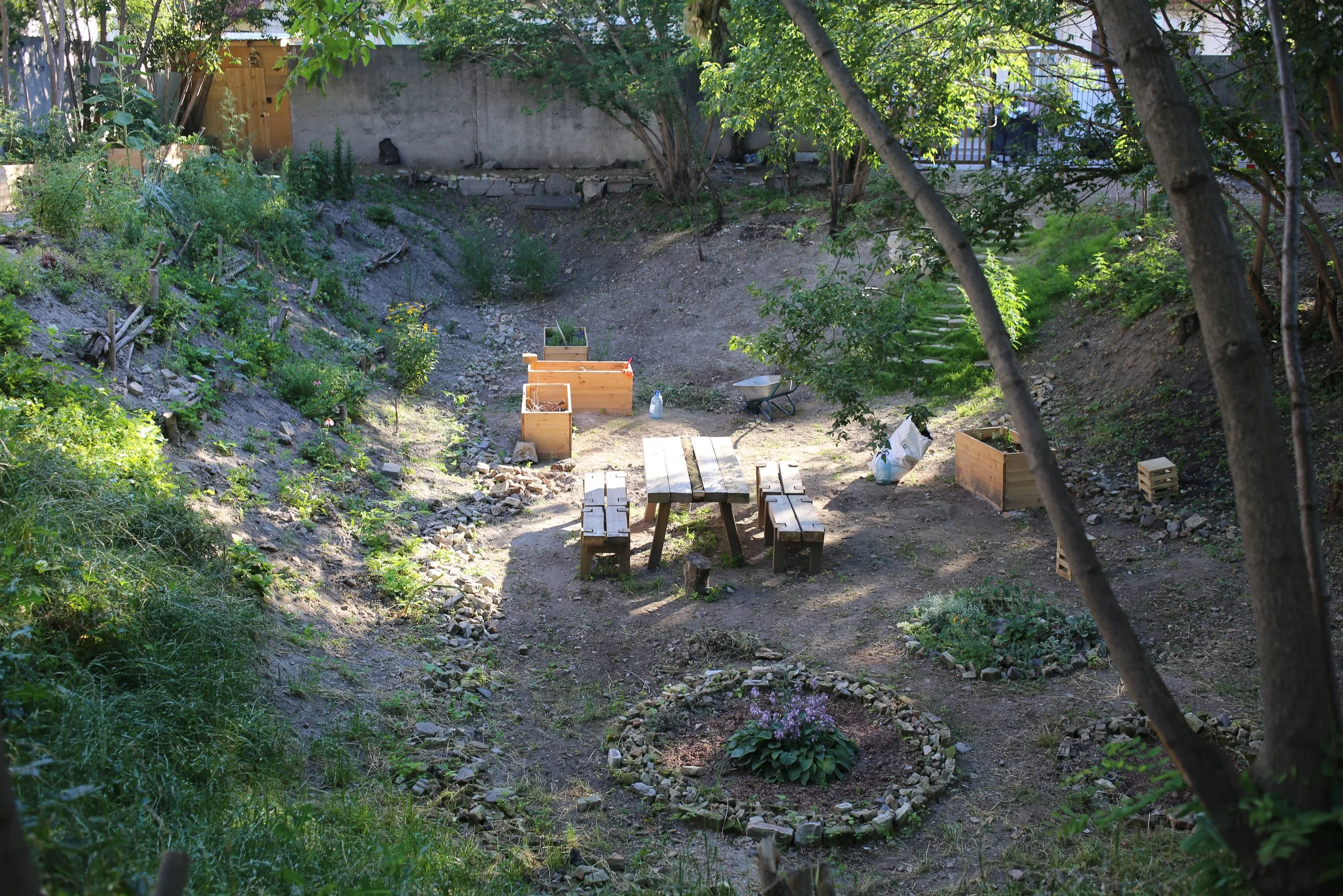 A 17th century building was knocked down in 1985 and the plot was walled in and left to its own devices. Nature took over but an invasive species of tree (American Maple) dominated the biosphere. With the constant threat of developers in Kyiv, we moved in and started building a dream. Half community garden, half zen garden. A much-needed green space in the neighbourhood.